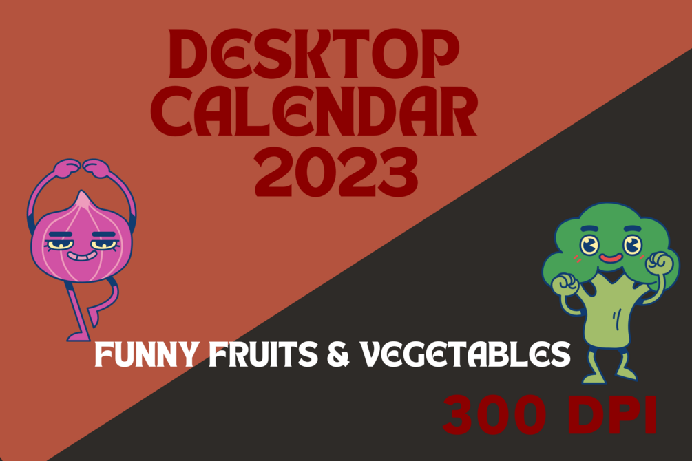 to December 2023. Funny fruits & vegetables images. There’s also cover with bright colorful fruits & vegetables.